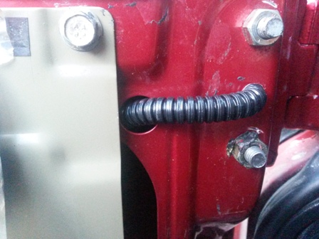 Step 10. I drilled an 11mm hole through the door in between the two door hinge bolt holes and fed my wires and convoluted tube through the door (See picture below)