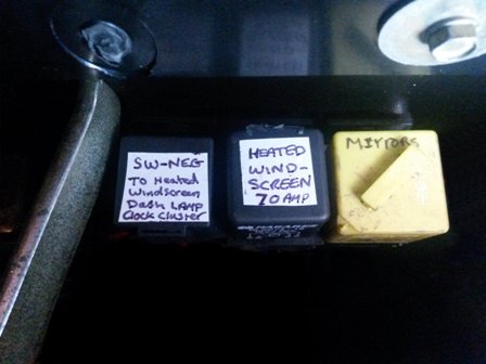 Next step was to install and wire up the two relays to control the heated windscreen and the mirrors. I used a 70amp relay for the windscreen and a 40amp relay for the mirrors. I did think about adding in a timed relay but as its only me that drives my Defender I think the noticeable orange glow off the heated screen warning lamp will remind me to turn it off (I might entertain the timed relay in the future and I will add to this page when done) (See pictures below for relay mounting behind clocks)